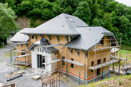 El tejado está formado por 2 capas de Gutex Thermoflex de 145 mm y un Gutex Multiplex-top de 35 mm como pantalla bajo el tejado. Como el cliente exigía un valor R superior a 8, el sistema de construcción del tejado se diseñó para conseguir un R = 8,70 y un desfase de más de 12 h para optimizar el confort en verano.