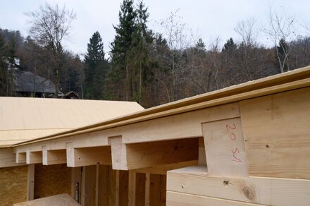 El tejado está cubierto con una capa de vegetación de sedum resistente, bajo la cual hay una capa de drenaje con depósito de agua e impermeabilización bituminosa. Se utilizaron paneles de fibra de madera Gutex Multiplex-top como segunda capa ventilada y conductora de agua, colocados sobre vigas con aislamiento entre vigas fabricado con materiales aislantes flexibles de fibra de madera. Con Gutex Multiplex-top se puede crear una subcubierta impermeable -a partir de una inclinación del tejado de 15°- gracias al perfil especial machihembrado de los paneles. No es necesario solapar ni encolar las juntas normales de los paneles.