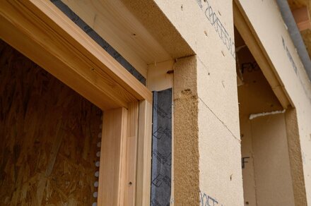 El aislamiento interior lo proporciona Gutex Thermoinstal de 50 milímetros, montado sobre marcos de madera con una capa intermedia de aislamiento de lana de madera y recubierto con un enlucido ecológico a base de arcilla. Gutex Thermoinstal permite crear planos de instalación para cables y tuberías, reduciendo los puentes térmicos en comparación con el aislamiento utilizado normalmente en las construcciones de listones. El panel de aislamiento de fibra de madera se coloca sobre toda la superficie, sin huecos, en el interior de la construcción de marcos de madera. A continuación, los conductos de servicio pueden fresarse en el panel de aislamiento de fibra de madera.