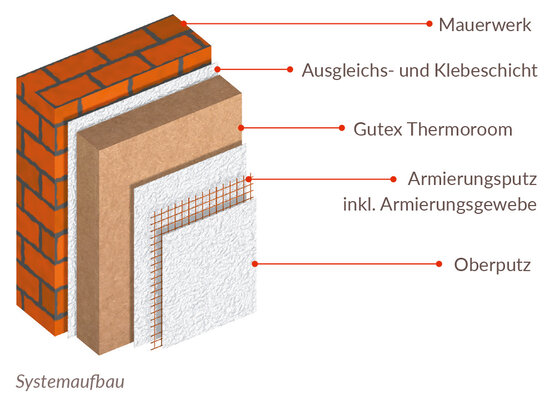 El sistema de aislamiento interior Intevio consiste en la placa aislante de fibra de madera Thermoroom, que se fija a la pared interior mediante el enlucido de unión y alisado Gutex. El tejido de refuerzo universal Gutex se integra en la capa de enlucido posterior.